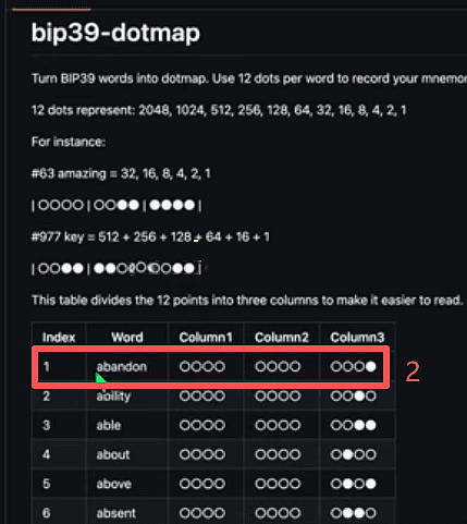 比如第一个词的点阵图是右侧最后一个地方有孔,我在助记词表里找一下,发现就是「abandon」。它的特征是前四位里边最后一位打孔了,中间四位里面的1和3打孔了。