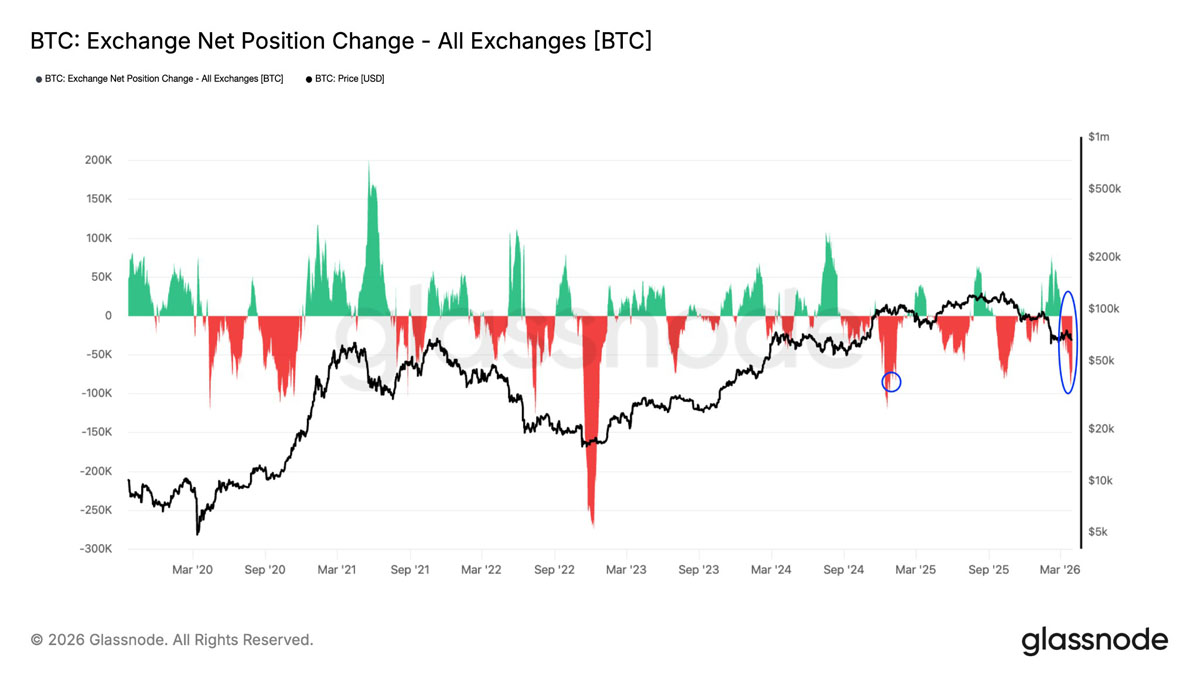 鲸鱼存款的急剧下降恰逢比特币在 3 月 26 日交易所净持仓减少 89,710 BTC,这是自 2024 年 12 月以来最大的涨幅,Glassnode 称。
