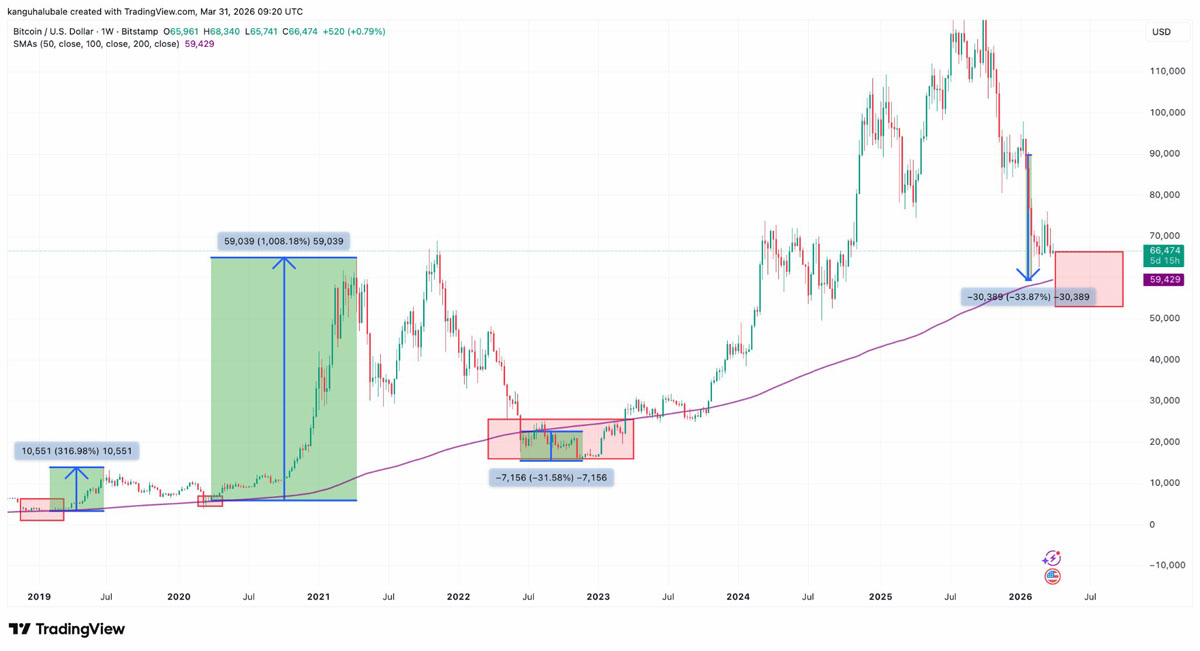 分析师 Crypto Patel 在最近的 X 帖子中表示 :“比特币仍高于 200 周移动平均线(59,000 美元)”,并补充道: