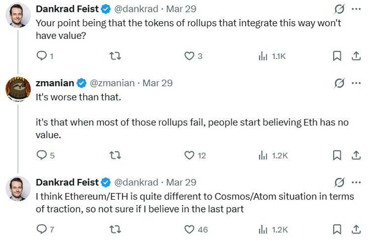 Gnosis 联合创始人 Martin Köppelmann 在 Feist 和 Manian 的讨论中反驳了这种比较。他将 EEZ 构建为同步组合性和对以太坊状态的访问,而非共享安全或收益模型。