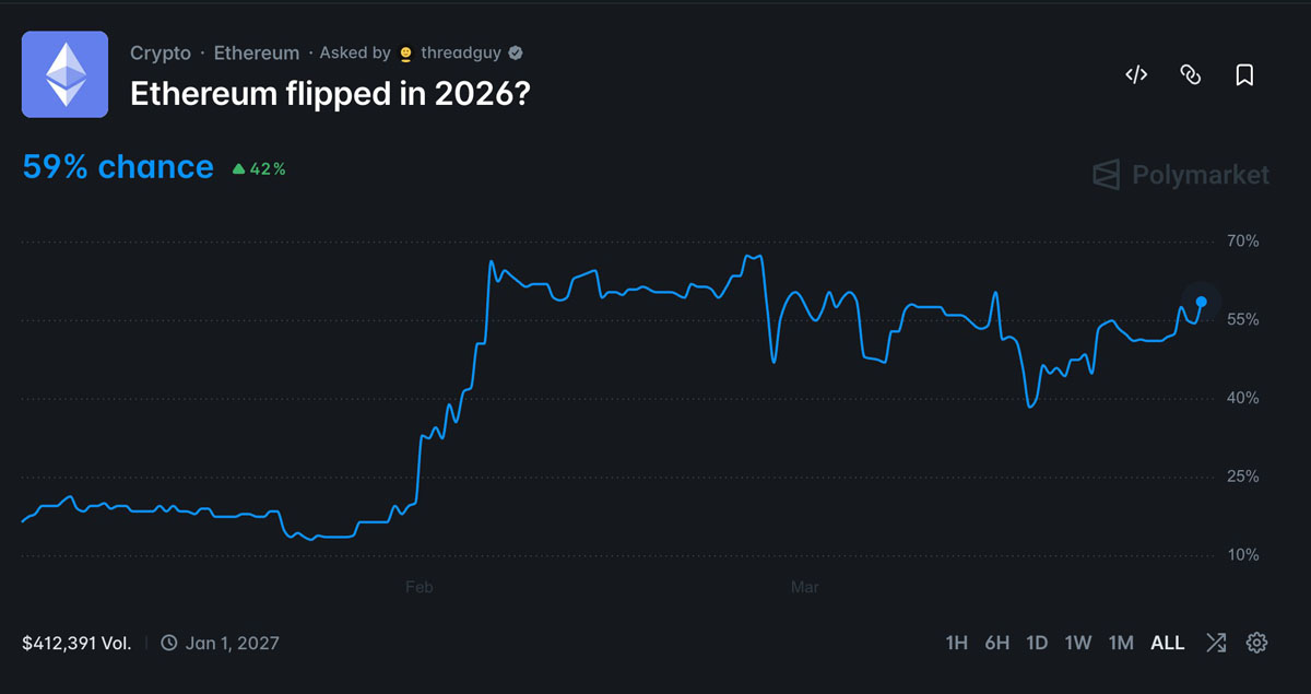 近 60%的投注者预计以太币将失去第二大市场,这一比例高于一月份的 17%。来源:Polymarket