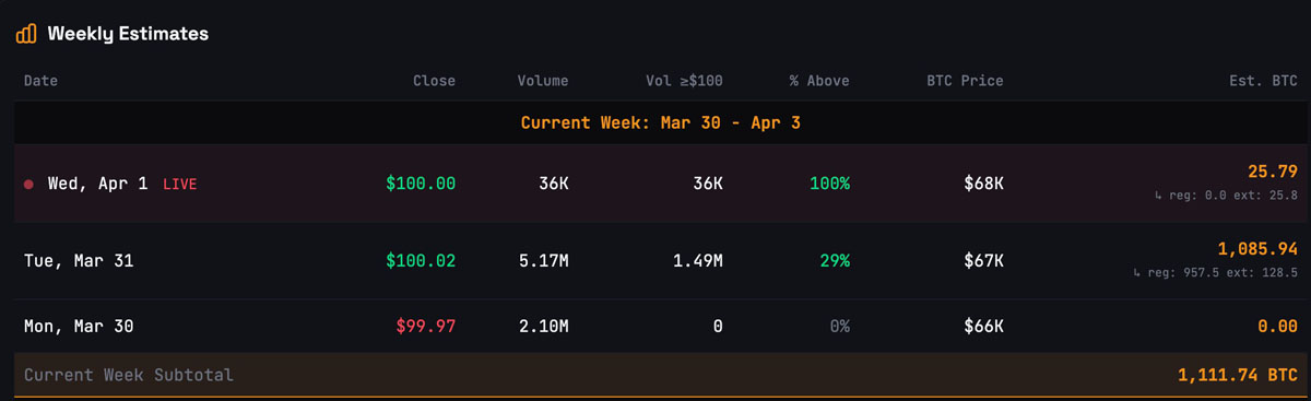 STRC.LIVE 显示,Strategy 在周二收盘前已筹集到超过 1085 枚 BTC 的资金,周总量升至 1111 多枚。这相当于约 7625 万美元。
