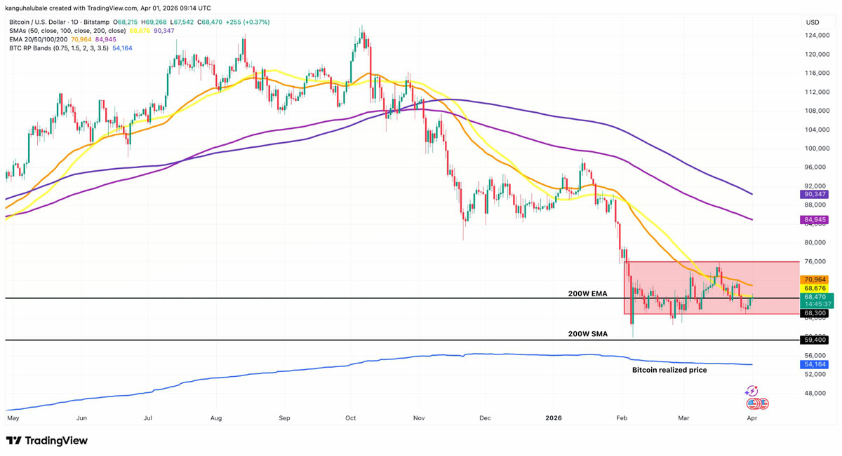 不过,值得关注的还有:200周EMA位于68,300美元,200周SMA位于59,400美元,这两者仍是关键阻力位。若跌破此水平,比特币的已实现价格——约54,000美元——将成为下一个重要支撑位。