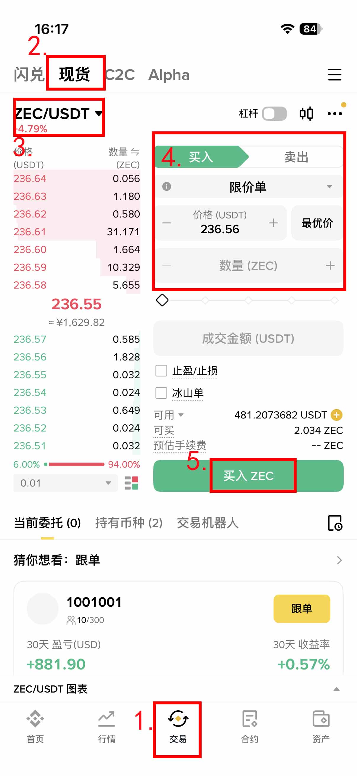 - 左上角搜寻并选择「ZEC/USDT」这组交易对