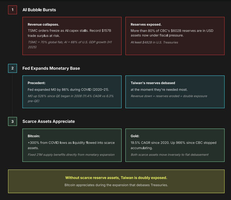 他补充道:“对台湾来说,比特币具有独特的地缘政治韧性:在中国封锁或入侵中,黄金被困或没收,美元储备可能受到限制,但比特币依然完全可及,无需实物运输。”