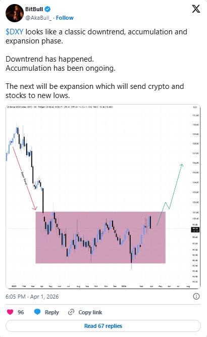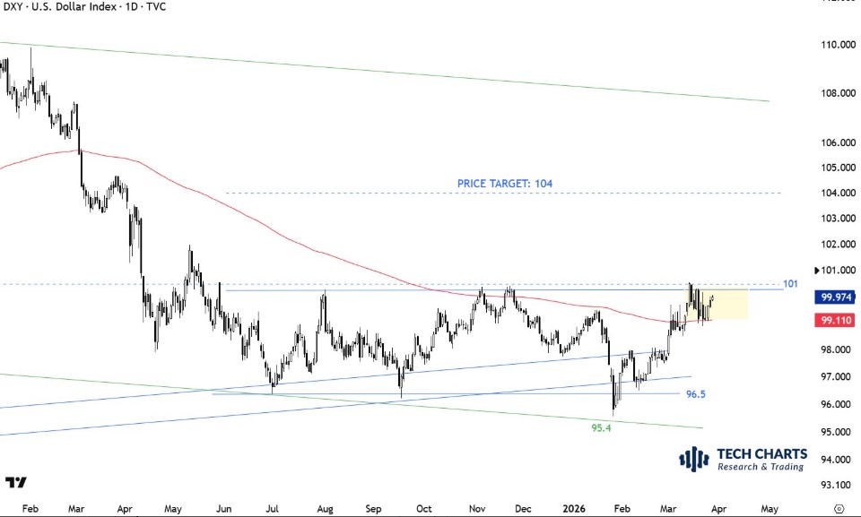 “DXY已蓄势待发,我们只等突破的确认。”交易员兼分析师Aksel Kibar上周在X上表示,并给出104的目标位——这是自2025年4月以来的最高水平。