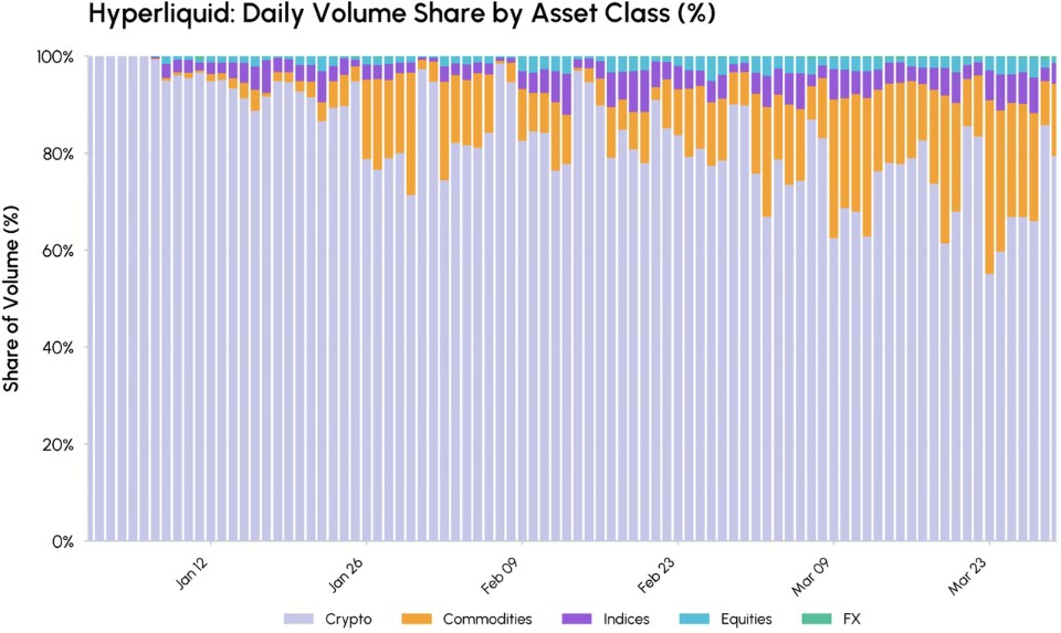 但在 2026 年 Q1,以 Hyperliquid 为代表的平台通过永续合约彻底抹平了这种割裂。数据指标显示,Hyperliquid 的非加密资产交易量占比已飙升至 45%。这意味着,全球交易员正在通过去中心化订单簿实时博弈原油、黄金与指数,而不再被动等待纽交所的钟声。