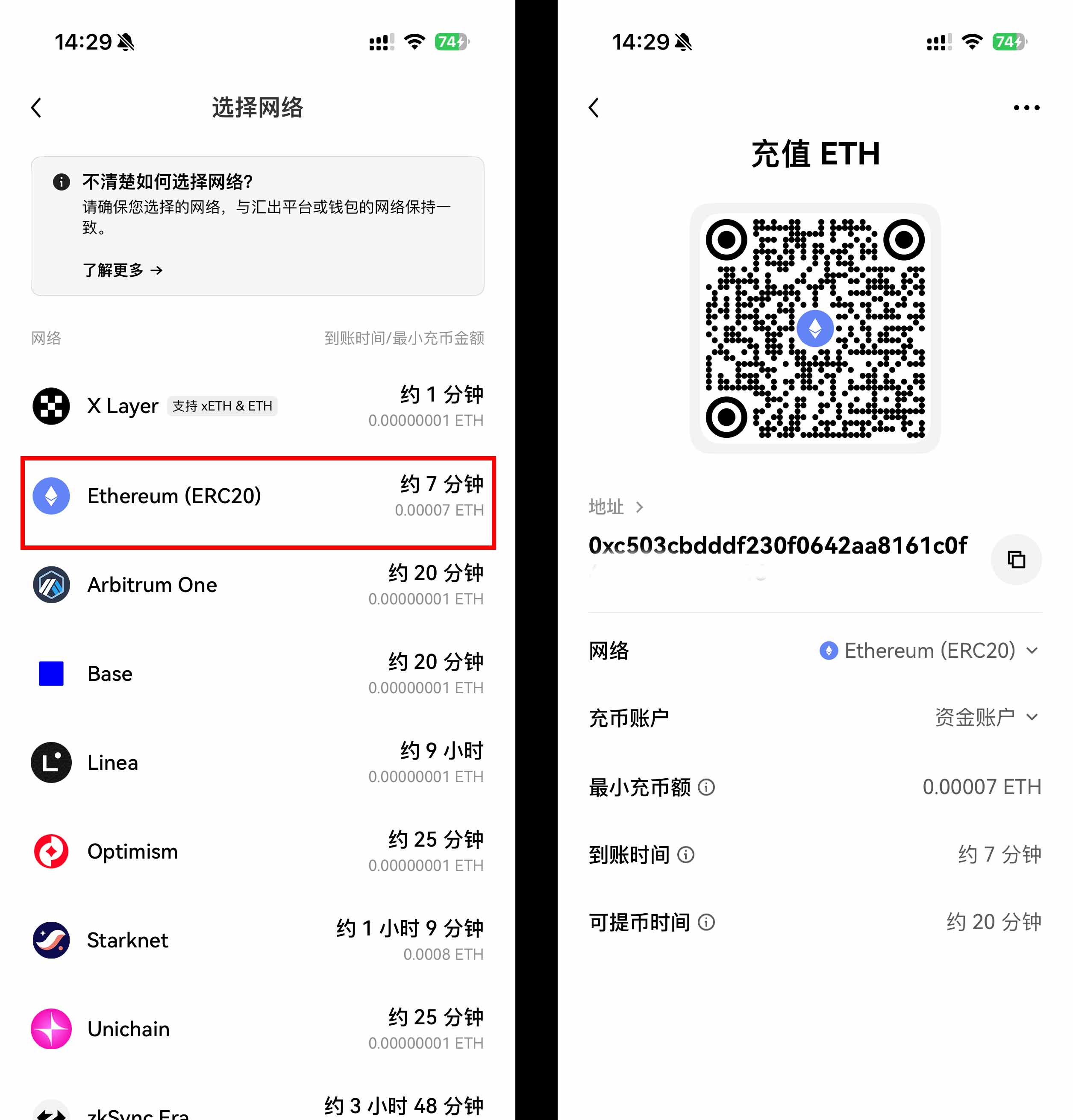 比如我要收ETH,选择完以太坊后,也会有不同的链。大家最常用的是Ethereum本链,也就是ETH-ERC20。
