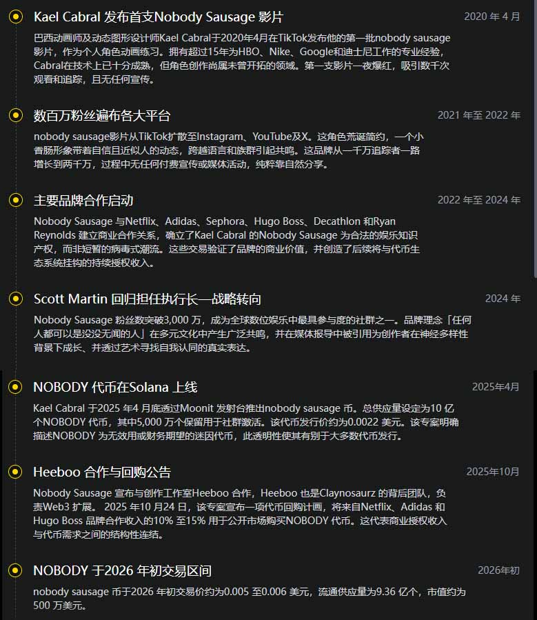 2025年10月24日,Nobody Sausage 宣布了一项发展,使Nobody Sausage Coin 拥有了很少有纯迷因代币具备的特点:与实际商业收入相链接。