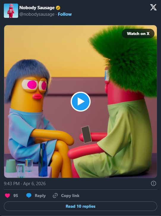 “当 Nobody Sausage 出现时,我们从未预料到最大角色品牌会在社交媒体上说,‘嘿,我们来合作吧’,”Pelekis 告诉 Decrypt。Cabral 从一开始就对他的愿景很清楚。“当 Kael 加入并与我们展开那些对话时,他真的很想做一个迷因代币,”Pelekis 补充道。团队也说明了取舍。管理一个代币社群需要大量时间,但它也为品牌提供了一种直接方式,将最忠实的粉丝纳入某个具体事物中。