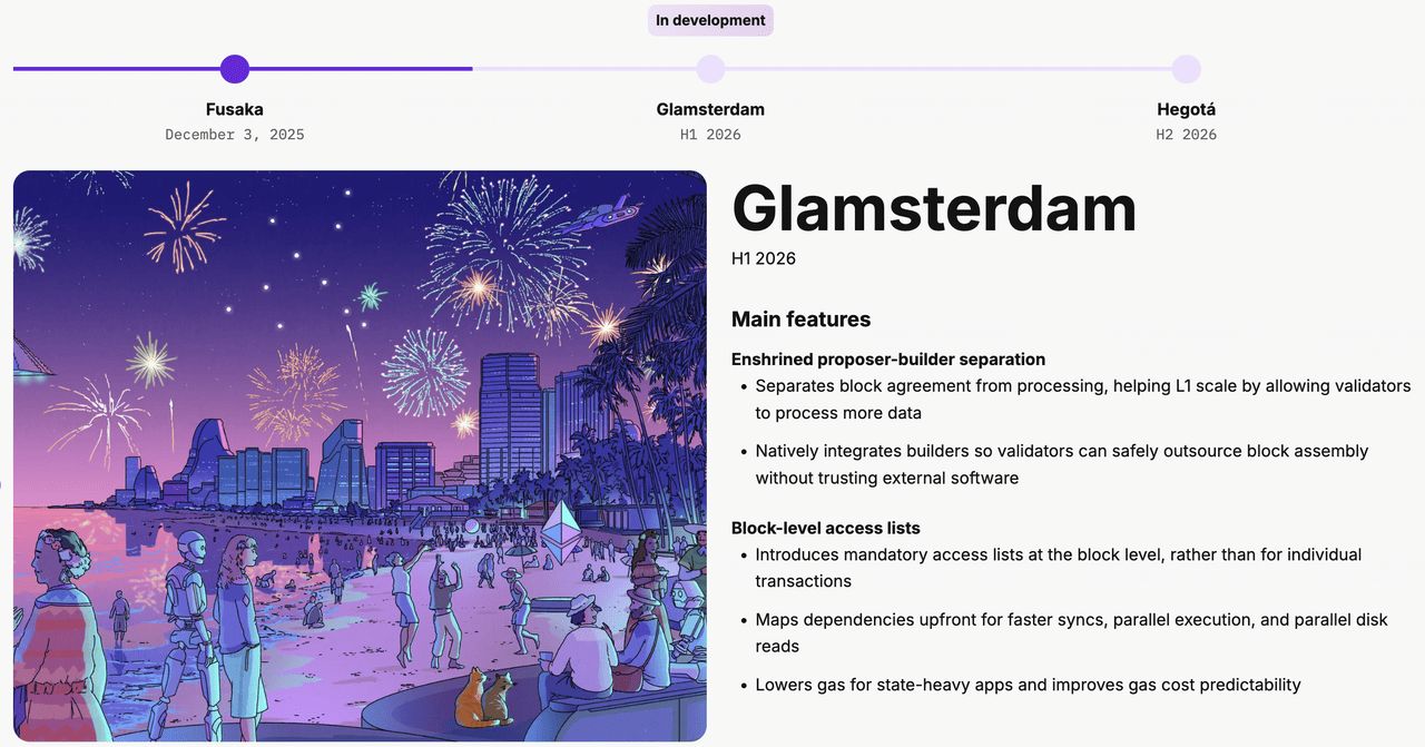 一旦Glamsterdam创建了并行运行和无信任区块构建的框架,网络将展望Hegotá(2026年下半年)。