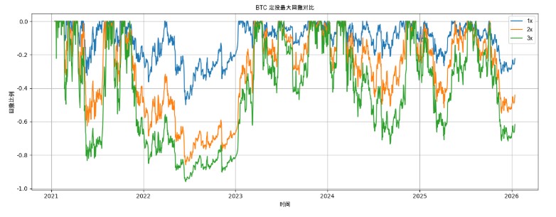 在过去五年的回测中,BTC 三倍杠杆定投的最终收益只比两倍杠杆多3.5%,却付出了接近归零的风险代价。
