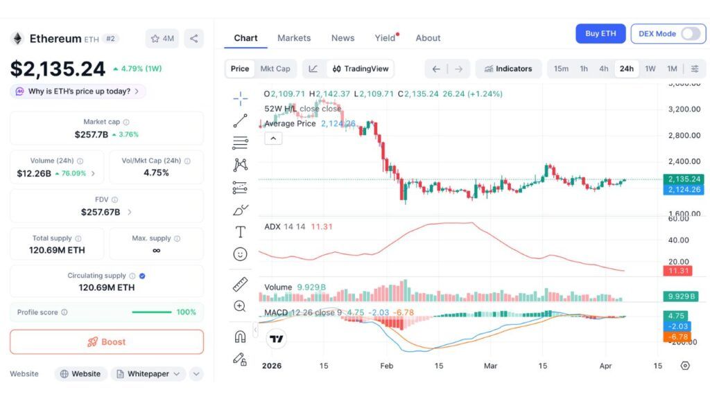 截至2026年4月6日,以太坊价格已重回2100美元大关,在主要交易所的交易价格区间为2112美元至2135美元。这一走势标志着短期市场情绪的显着转变,并使全球第二大加密货币再次受到关注。但除了这一消息之外,这一发展还代表着更重要的意义:一个关键结构层面上正在展开的强劲上涨势头。