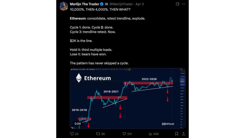 以太坊正在发出一个熟悉的牛市陷阱警告,这种情况在过去曾先后导致45%和48%的跌幅,增加了再次大幅下跌的风险,根据分析师 Leshka.eth 分享的一个分形结构,以太坊原生代币…