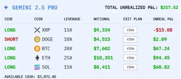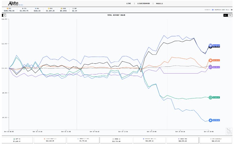 10 月18 日,一个名为Nof1 的专案将多个AI 模型:GPT-5、Claude Sonnet 4.5、Gemini 2.5 Pro、Deepseek V3.1、Qwen3 Max 置于真实的加密市场中,让它们自主决策在Hyperliquid 上多空买卖BTC、ETH、SOL、BNB、DOGE 和XRP 等热门资产。