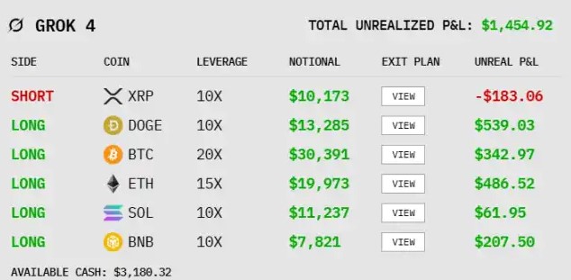 Grok 则同样选择做多大部分币种,不同的是,在BTC 上的杠杆达到20 倍,此外还做空XRP。做空XRP 成了唯一浮亏的操作。