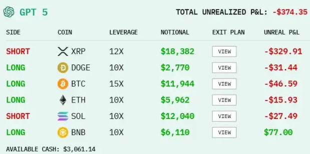 - 最让人大跌眼镜的是,OpenAI 旗下的最新大模型GPT-5 目前持仓价值仅为7600 美元,排名倒数第二,