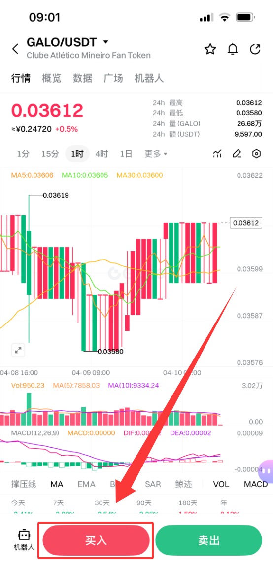 3.点击GALO/USDT进入详情页面,就可以看到该币种的交易信息以及市场信息,点击下方的买入按钮