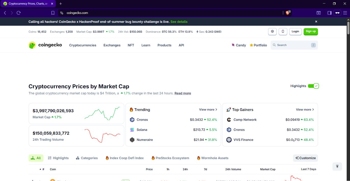 CoinGecko 是最早也是最受欢迎的加密数据提供商之一。其 API 提供代币价格、市场市值和排名,是开发者入门的理想选择。