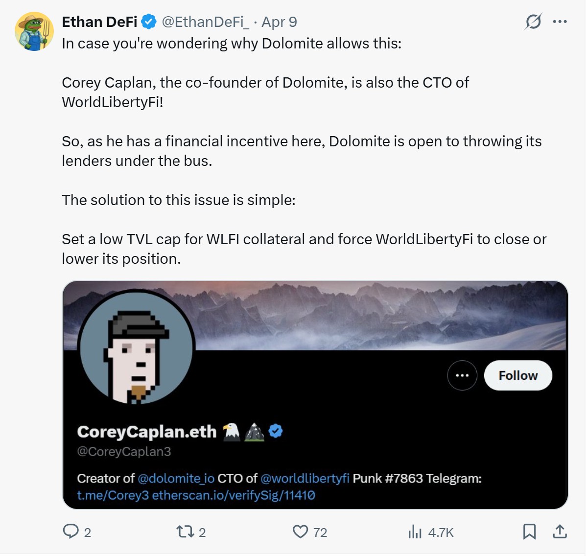 “WLFI 拥有近 100 亿美元的 FDV,但它并不是一个流动性极高的资产,”一位用户在 X 上写道。“所以想象一下,如果 WLFI 总供应量的 5%突然需要出售以清算该头寸,会发生什么,”他补充道。