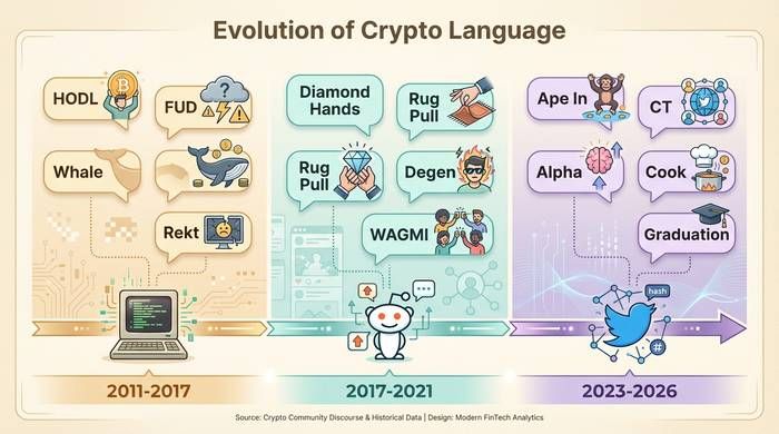 加密货币俚语并非无意义的噪音,而是这个社群经历的鲜活记录。每个术语都承载着一段故事:市场崩盘、集体狂热、有人因此损失房租、有人靠着一次中奖买房。这种语言起源于2010年代初的Bitcointalk论坛,在ICO热潮期间转移到Reddit,在DeFi夏季期间又转移到加密货币推特,如今则活跃在Telegram群组和Discord服务器中,在那里,加密货币交易者们用一种外人难以理解的方言交流。