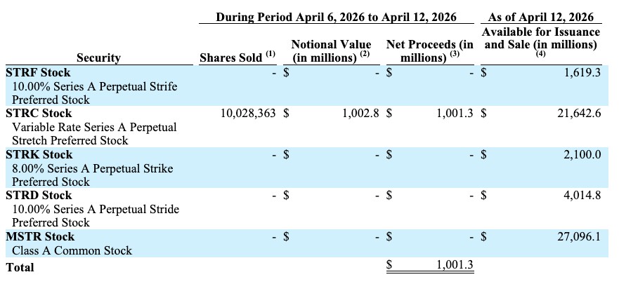 该公司上周出售了1000万股STRC股票,名义价值和净收益合计约10亿美元。在此期间,未出售任何STRF、STRK、STRD或MSTR股票。