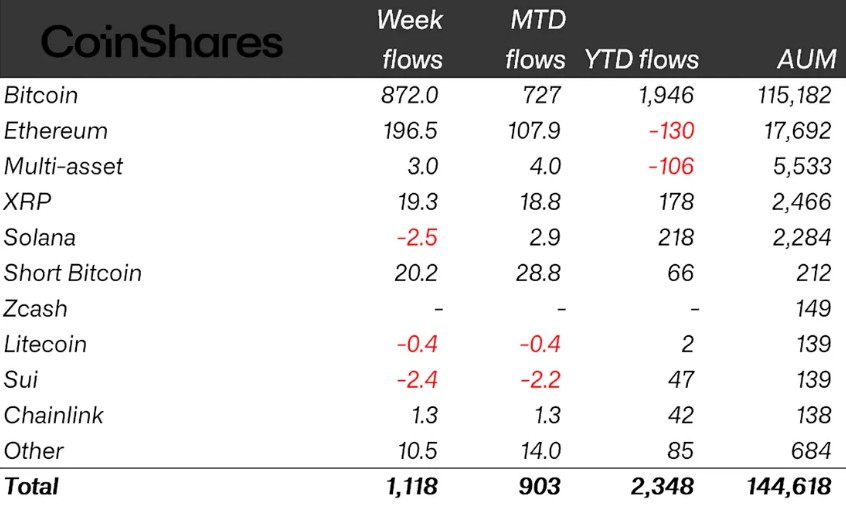全球加密货币交易所交易产品(ETP)上周资金流入达11亿美元,其中比特币以8.71亿美元的流入量位居榜首,CoinShares周一报告称。