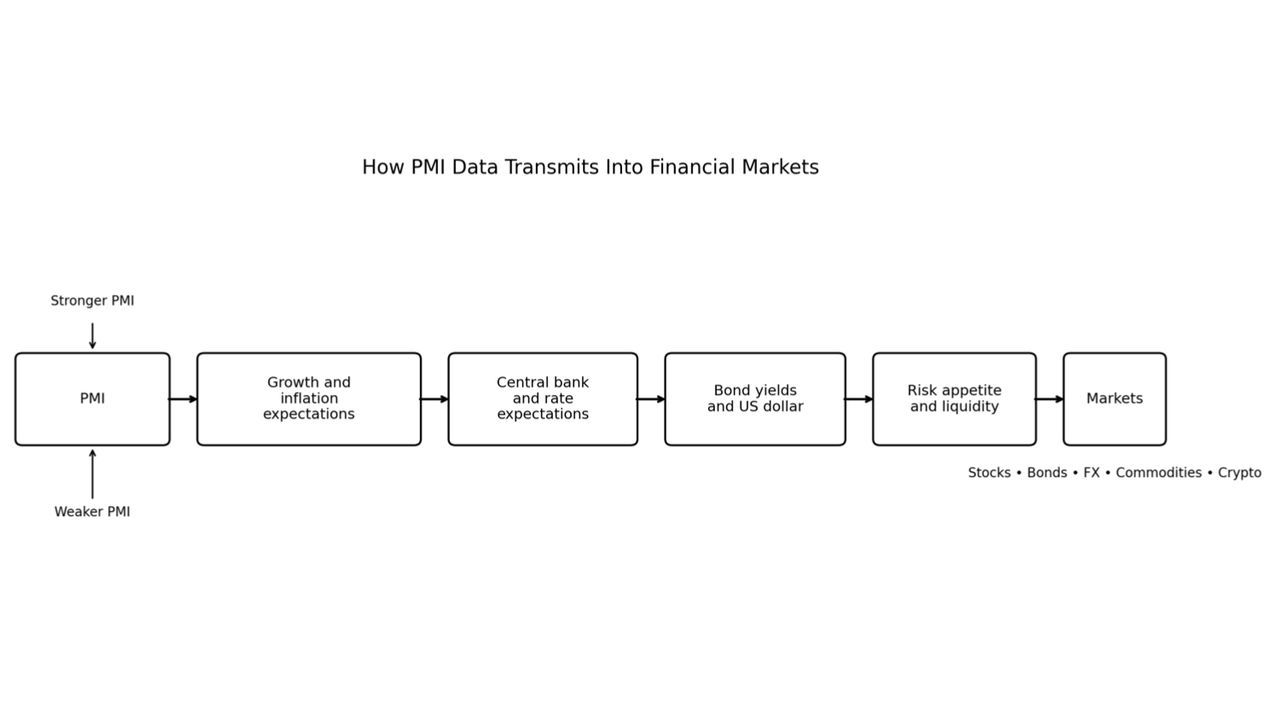 经济学家使用它来判断扩张是否正在获得动能或失去势头。中央银行通过它来观察通胀压力和需求状况的线索。投资者利用它来重新评估股票、债券、货币、商品和其他风险资产的价格。甚至加密货币市场也经常在 PMI 数据显着改变利率、流动性和风险偏好前景时作出反应。