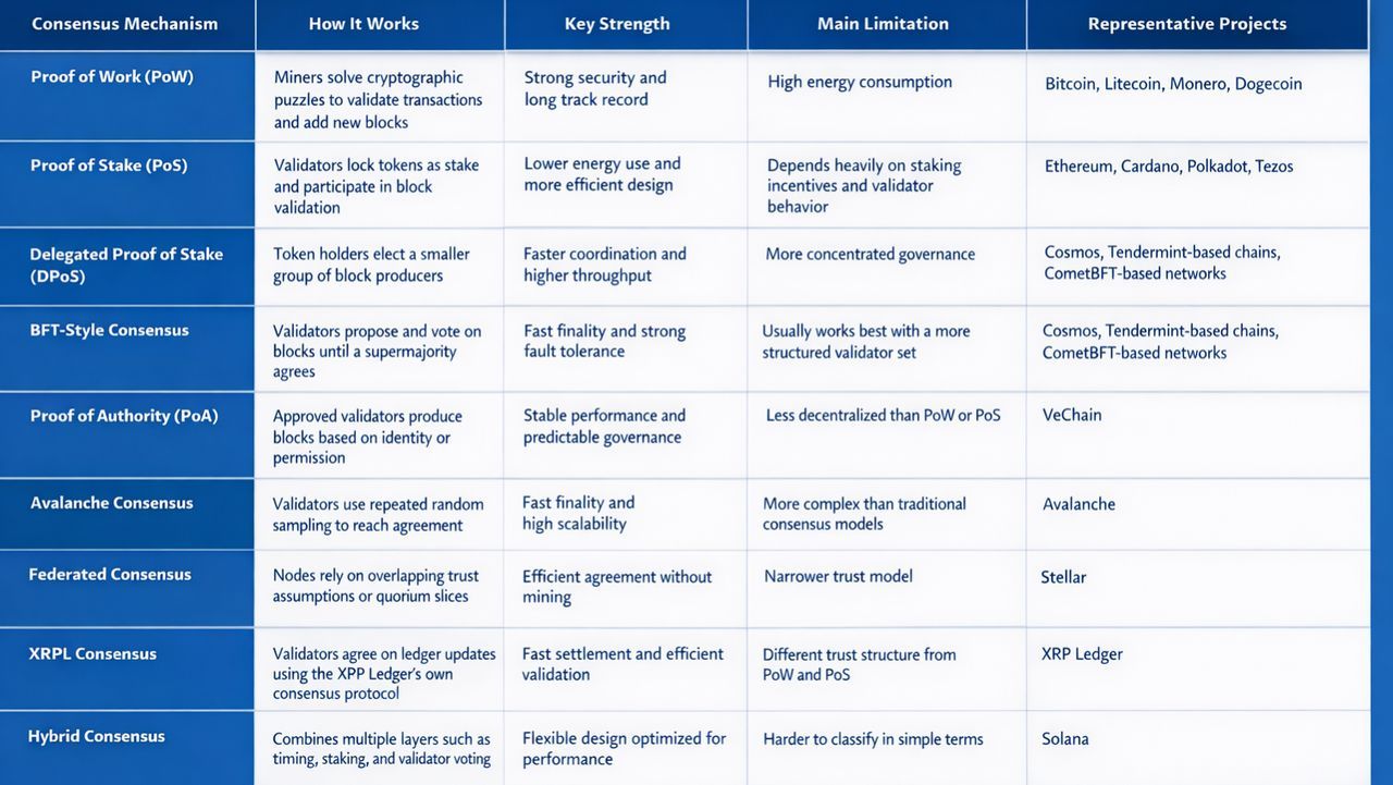 此表格提供区块链网络中主要共识机制的快速比较,说明每种模型的工作方式、主要优势、关键限制,以及与其最常相关的代表性项目。
