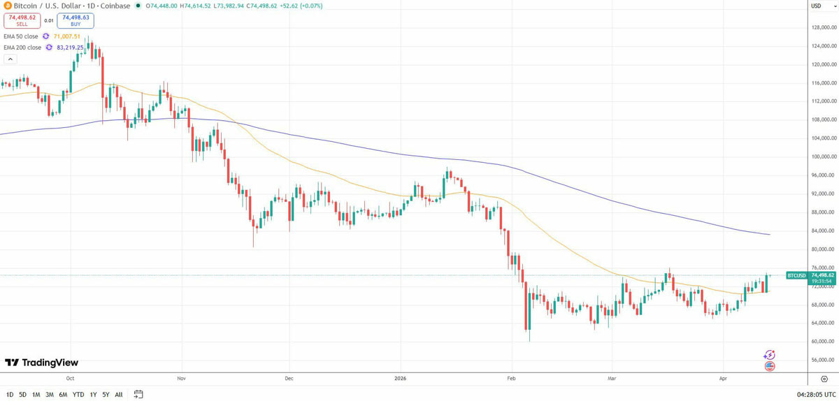 尽管今日比特币涨至接近7.5万美元,但分析师们仍持看跌情绪,原因是市场重新燃起对美国与伊朗达成协议的希望,有望结束持续数周、令全球市场承压的冲突。
