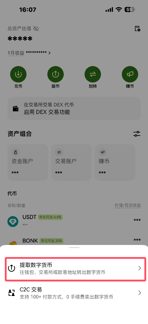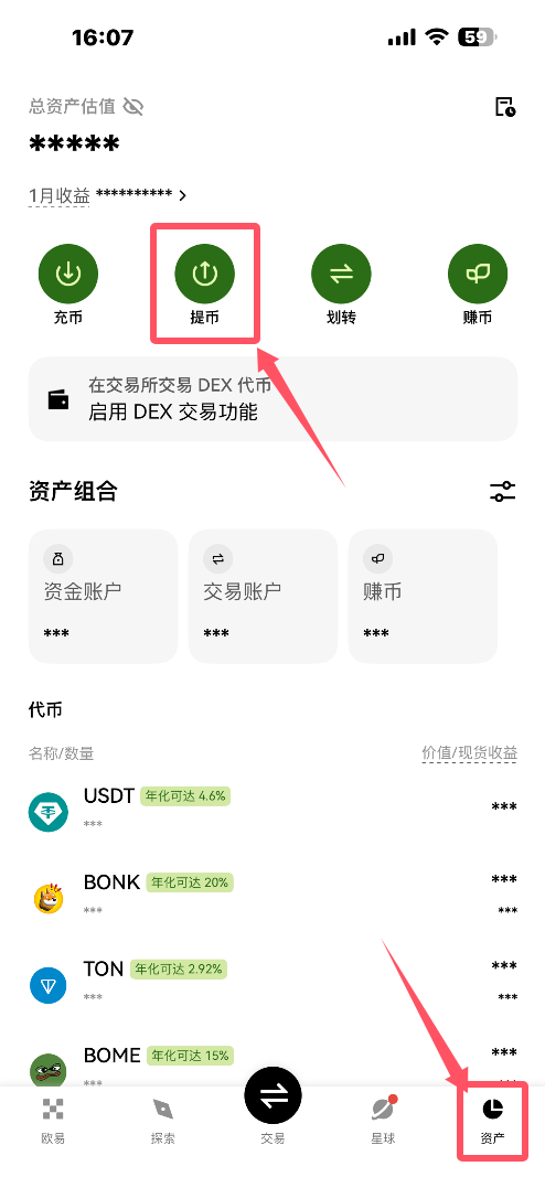 1.进入欧易官网APP,点击资产-提币,如图