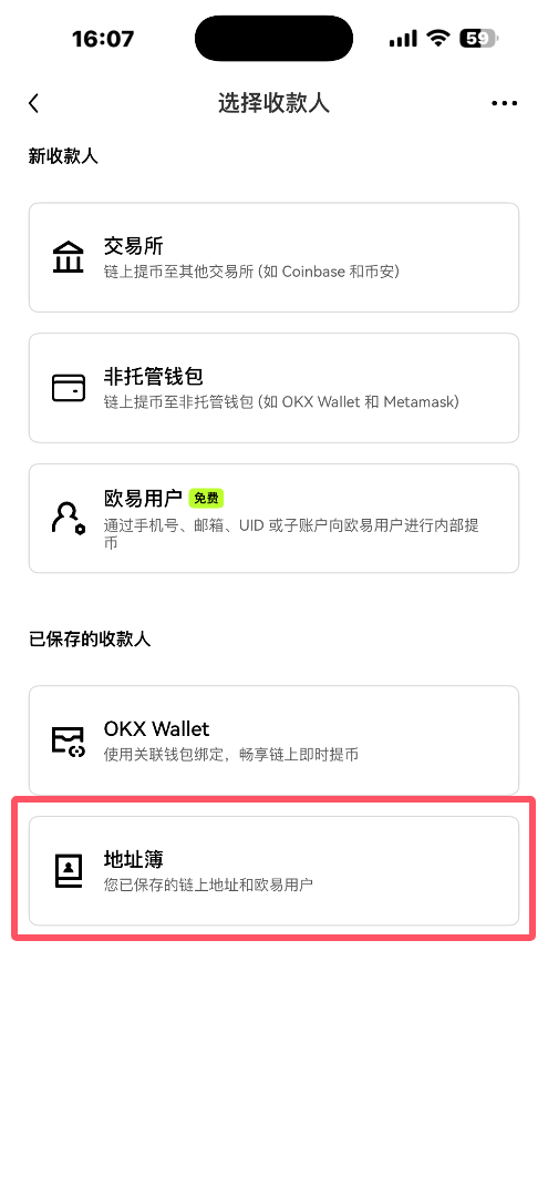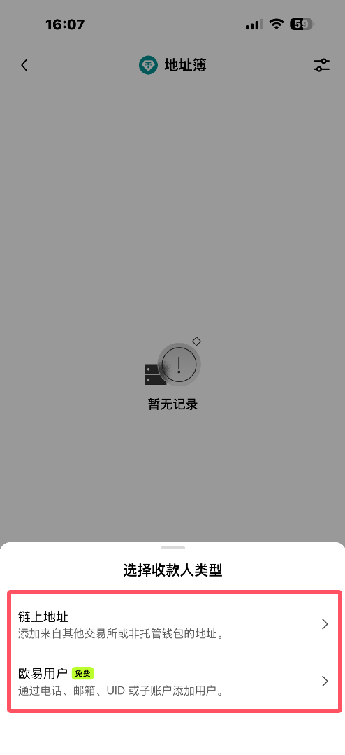 6.选择收款人类型,有俩种收款人可以选择,链上地址:直接输入对方收款链接;欧易用户:通过电话、邮箱、UID或子账户添加用户。