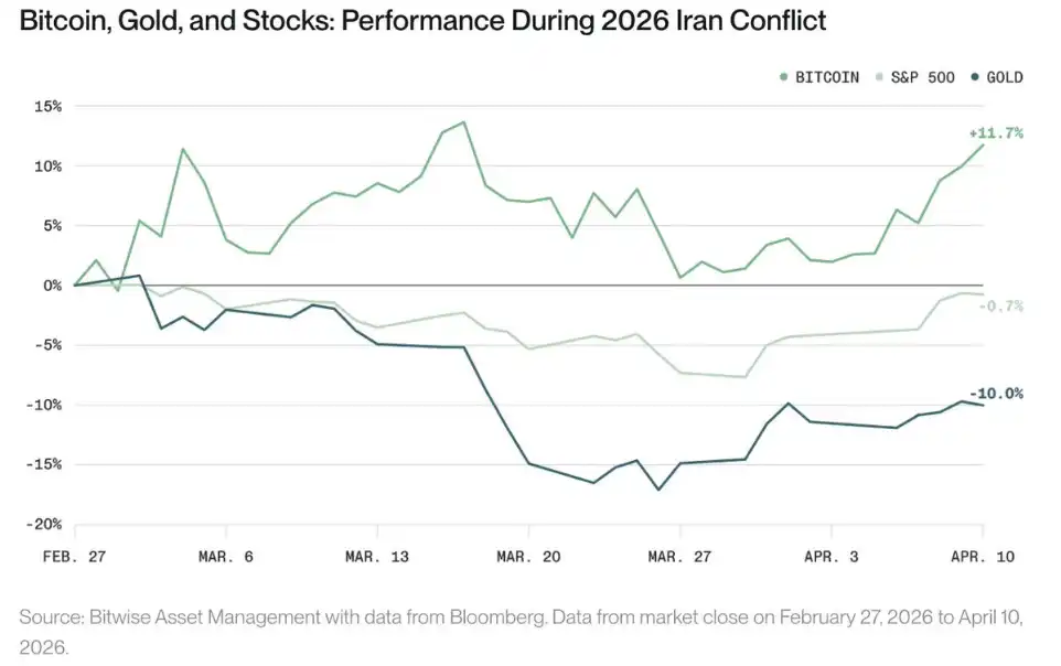 比特币在伊朗冲突爆发以来表现相对强劲。自 2 月 28 日美国和以色列开始对伊朗发动空袭以来,比特币上涨了 12%,而标普 500 指数下跌了 1%,黄金则下跌了 10%。