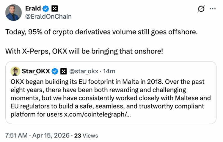 此次发布紧随OKX于2025年3月宣布已收购一家在马耳他获得MiFID许可的实体之后,该许可使该交易所得以将其衍生品交易扩展至整个欧洲经济区。