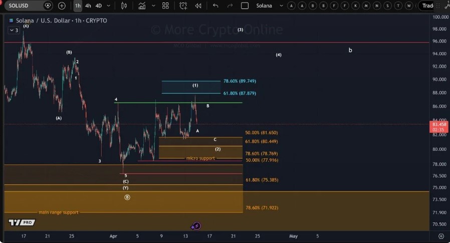 分析师表示,SOL股价在卖方压低价格之前几乎触及了87.87美元的目标区域。因此,目前的上涨行情更像是回调,而非强劲的趋势反转。用艾略特波浪理论来说,这意味着反弹力度尚未达到足以确认更大突破的程度。