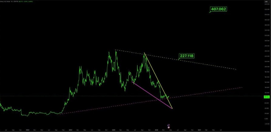 分析显示,Solana 目前交易价格高于一条向上倾斜的支撑趋势线,该趋势线自 2023 年底以来一直支撑着其整体结构。与此同时,图表显示上方存在一条下降阻力线,目标价位接近 227.12 美元。如果 SOL 继续守住当前底部,该价位将代表一个重要的突破区域。