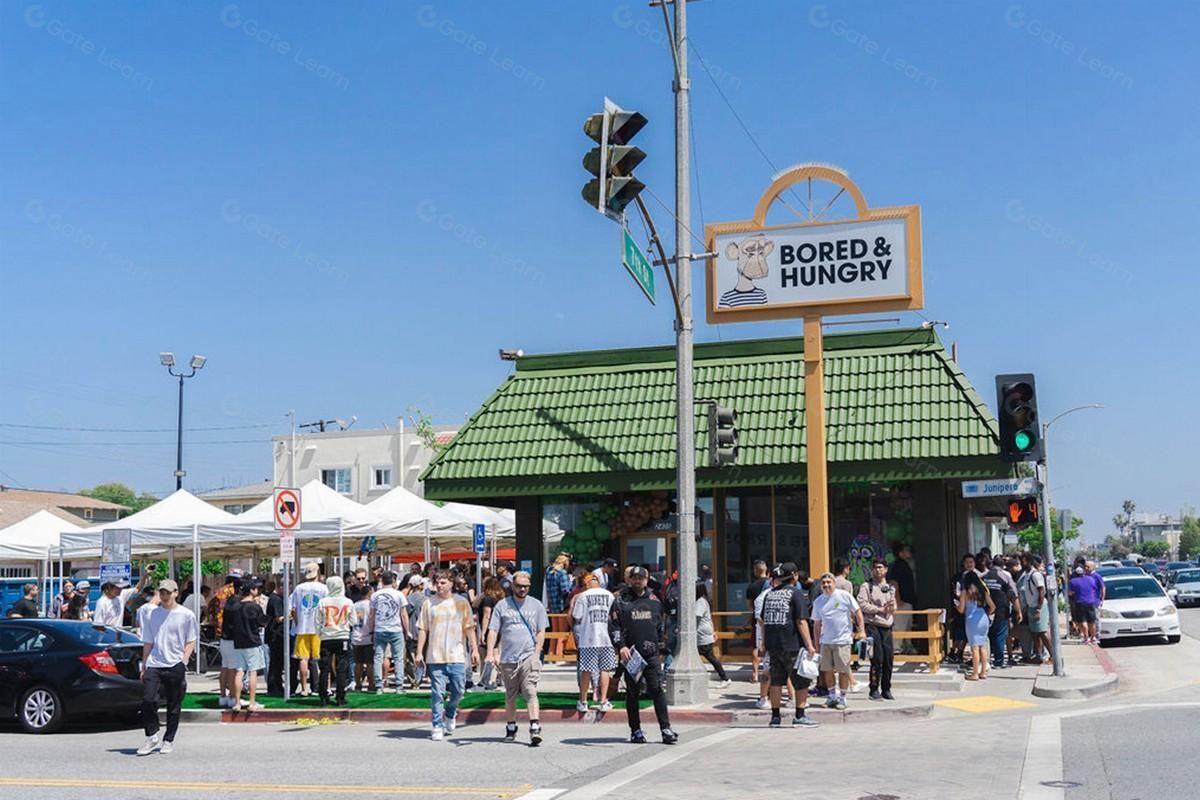 位于加州长滩的无聊猿游艇俱乐部主题餐厅外,群众络绎不绝的景象。