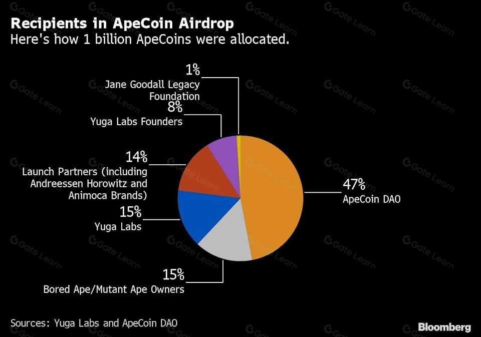 根据猿币 DAO 的资讯,APE 的总数为 10 亿,其中有 15% 空投给 BAYC 与 MAYC 的持有人,47% 转入猿币 DAO 成为生态发展基金,Yuga Labs 和其创办者们分别获得 15% 与 8%,但须等待一年的解锁期后才会渐进释出,14% 由协助猿币 DAO 成立的机构取得,1% 捐赠给珍古德基金会从事黑猩猩保育。
