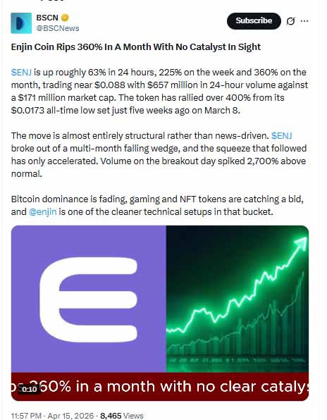 Enjin Coin 今日上涨 24%,交易价格约为 0.0777 美元。与之前的走势不同,这次确实存在一个催化剂。