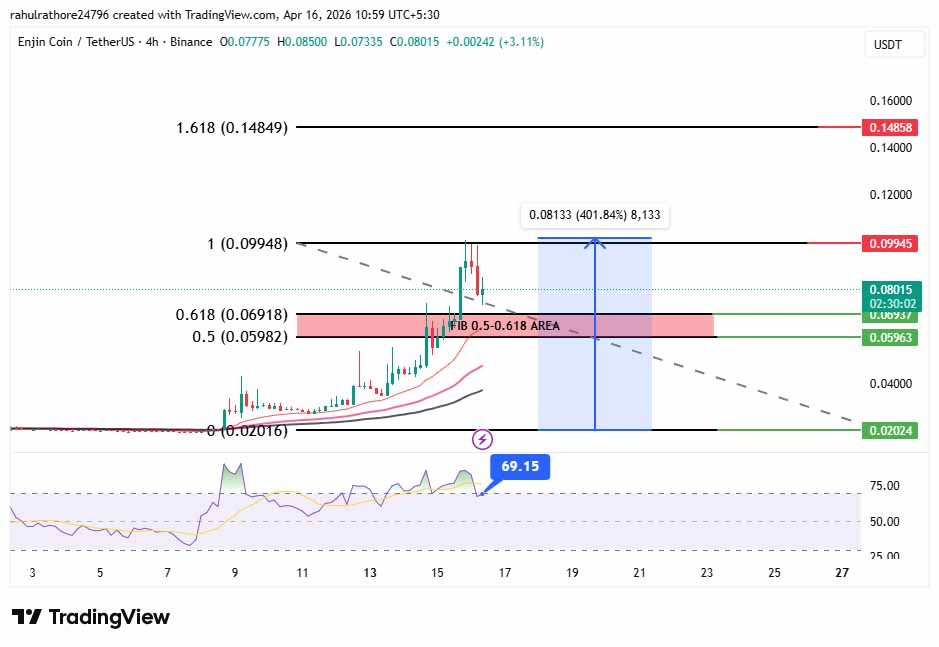 图表清晰地展现了这一走势。在经历了长期的下跌趋势后,Enjin Coin 从 4 月 8 日的低点0.0202 美元大幅反弹,最高价接近0.0994 美元。短短一周内,涨幅高达 401%。