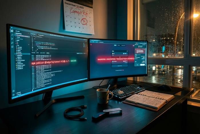 第二起事件是2023年12月14日发生的Connect Kit漏洞事件。针对Ledger的NPM Connect Kit库(用于去中心化应用程序与Ledger设备通信的一小段代码)的供应链攻击,源头指向一个仍拥有发布权限的被钓鱼攻击的前员工账户。在恶意库被发现并替换之前,DeFi用户损失了约60万美元。