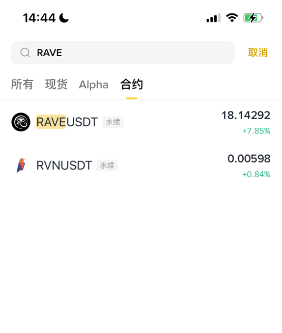 3、输入【RAVE】,这时下拉会显示合约RAVE USDT,点击【RAVEUSDT】。