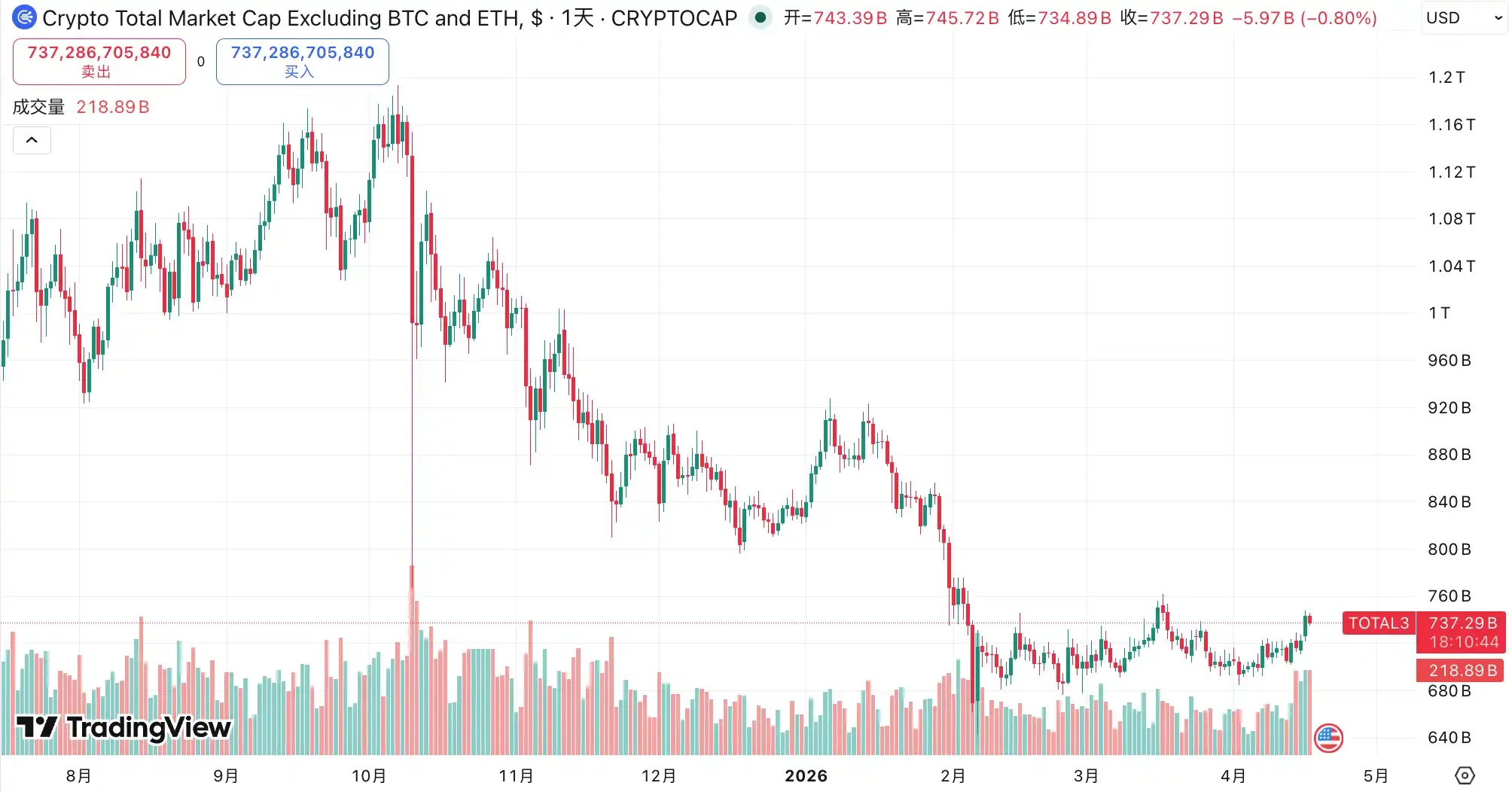 从 2024 年 12 月到 2026 年 4 月,不含比特币和以太坊的山寨币总市值,从峰值约 1.16 万亿美元缩水到约 7000 亿美元,蒸发了将近 40%。市值萎缩到足够低的时候,游戏规则就变了,价格不再由市场共识决定,而是由谁掌握了足够多的筹 码决定。