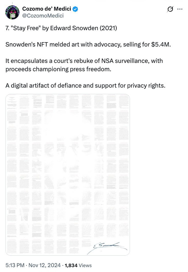 基金会还成为美国举报人爱德华·斯诺登数字艺术的举办场所,他的 NFT 作品《保持自由》于 2021 年售出约 2,200 以太币2021年约2,200以太币,当时价值约500万美元。