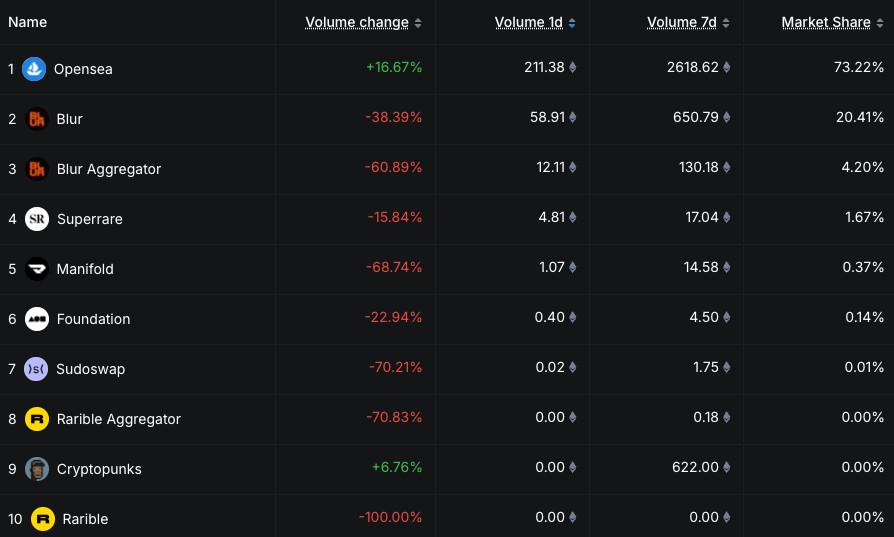 据DefiLlama称,尽管整体市场出现下滑,OpenSea仍稳居NFT市场的主导地位,截至发稿时,其占整个行业活动总量的73%以上,而Blur等竞争对手正对其构成挑战。