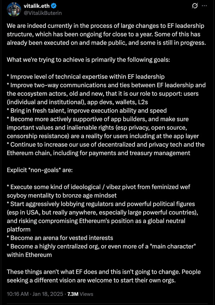 2025年1月,联合创始人维塔利克·布特林宣布对以太坊基金会进行大刀阔斧的改革,以回应以太坊社区针对生态系统长期发展方向日益增多的批评。