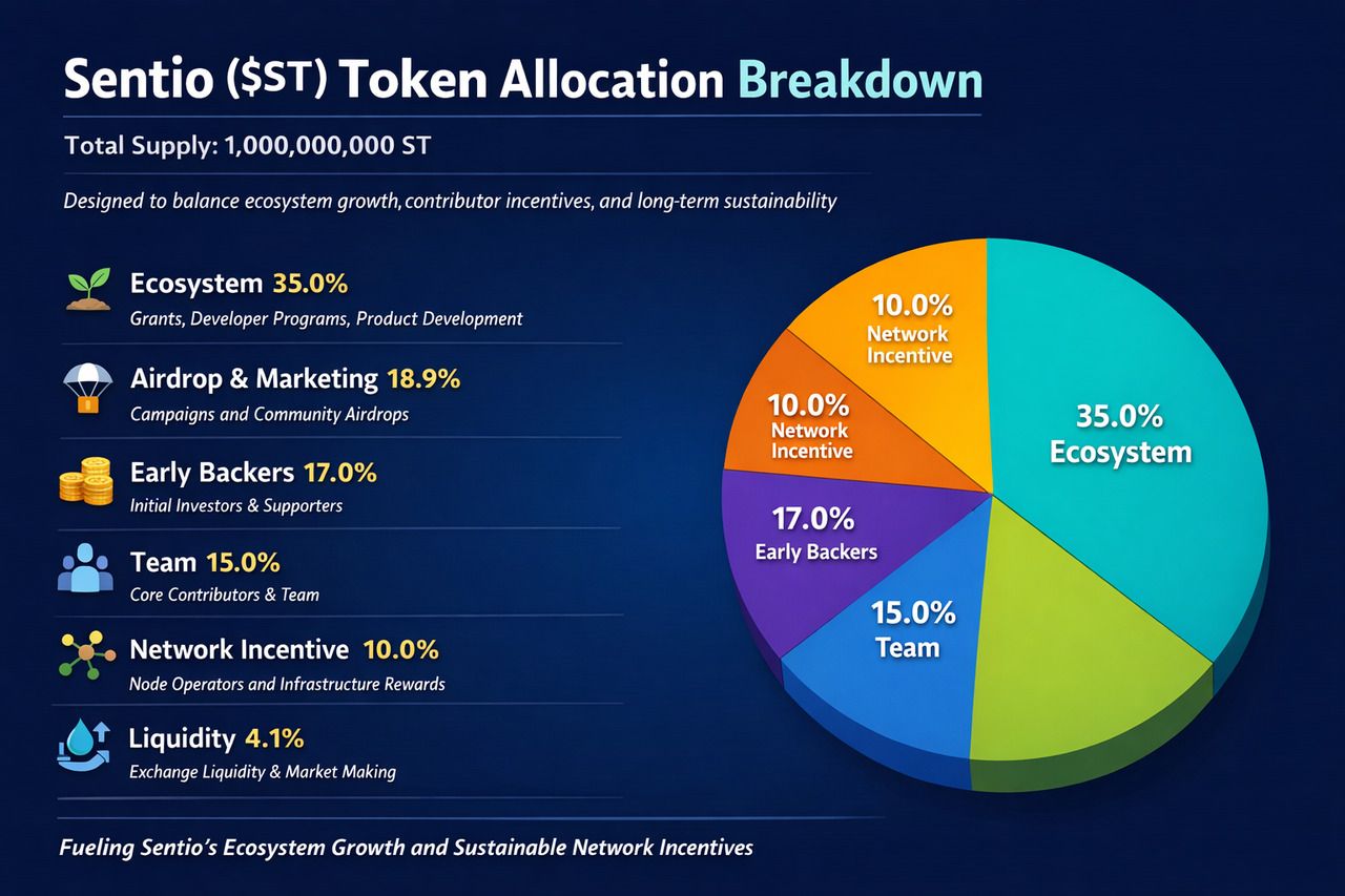 作为 Sentio 生态中的内核功能代币,ST 总量 10 亿枚,主要用于支持平台资源调度和生态激励机制。作为实时链上数据网络中的价值媒介,ST 的设计目标是让数据服务使用、网络资源分配和生态参与形成统一的经济循环。