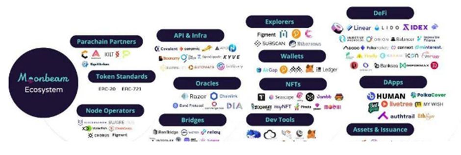 目前 Moonbeam 生态上的项目发展已经非常丰富,Moonbeam 生态中所部署的项目,分布各个区块链领域,包括 DeFi、NFT、预言机、浏览器、加密钱包、保险、Bridges、Collators、Dapps、Parachains 等。