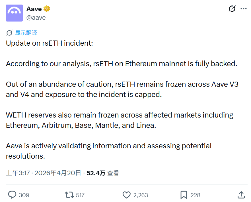 目前,Aave 官方更新动态表示,以太坊主网上的 rsETH 得到充分支持。出于谨慎起见,rsETH 在 Aave V3 和 V4 上仍保持冻结状态,且对该事件的敞口被限制。WETH 储备在受影响的市场(包括以太坊、Arbitrum、Base、Mantle 和 Linea)上也保持冻结。