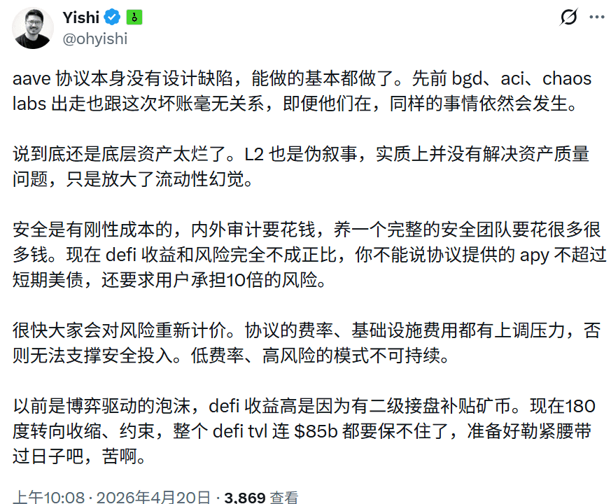OneKey 创始人 Yishi 则直言,「本次事件 AAVE 协议本身无设计缺陷,根源是底层资产太烂,L2 也是伪叙事,实质上并没有解决资产质量问题,只是放大了流动性幻觉。」
